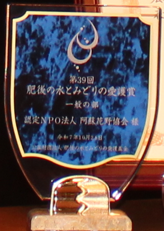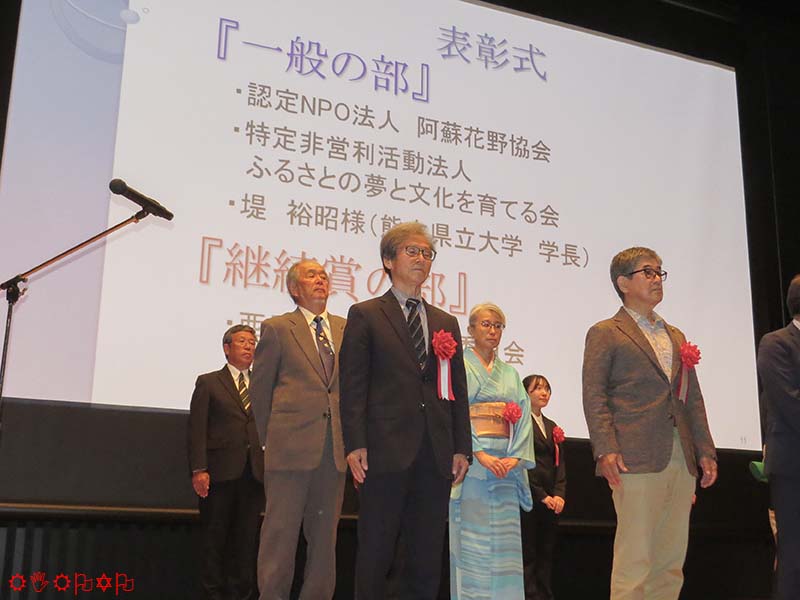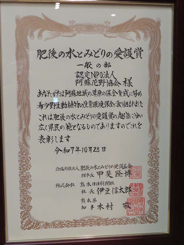 「第39回 肥後の水とみどりの愛護賞表彰式・講演会」(於) 肥後銀行本店ビル 2F 活動年数21年の「認定NPO法人阿蘇花野協会」が「一般の部」で表彰されました。賞状・盾・活動助成金が授与されました。